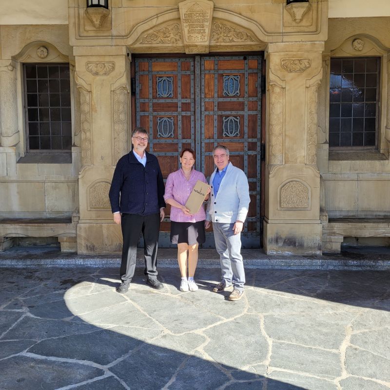 Der 6. April war ein ereignisreicher Tag in der Martinskirche. Im Anschluss an den morgendlichen Sonntagsgottesdienst durfte der Vorsitzende des Fördervereins und des Kirchengemeinderates Thorsten Rach zusammen mit Pfarrer Thomas Soffner Erika Kauerhof den zehnten goldenen Dachziegel für das Erreichen des Spendenstands von 275.275€ überreichen. Es freute die Verantwortlichen sehr, dass das Los auf Frau Kauerhof fiel, die bereits langjährig den Spendenweg“ alles unter einem Dach“ als Patin mit ihren monatlichen Beitrag unterstützt. Alle drei freuten sich nach der Übergabe auf Ihre nächste Begegnung auf dem Crossover-Konzert, das am selben Abend stattfand.